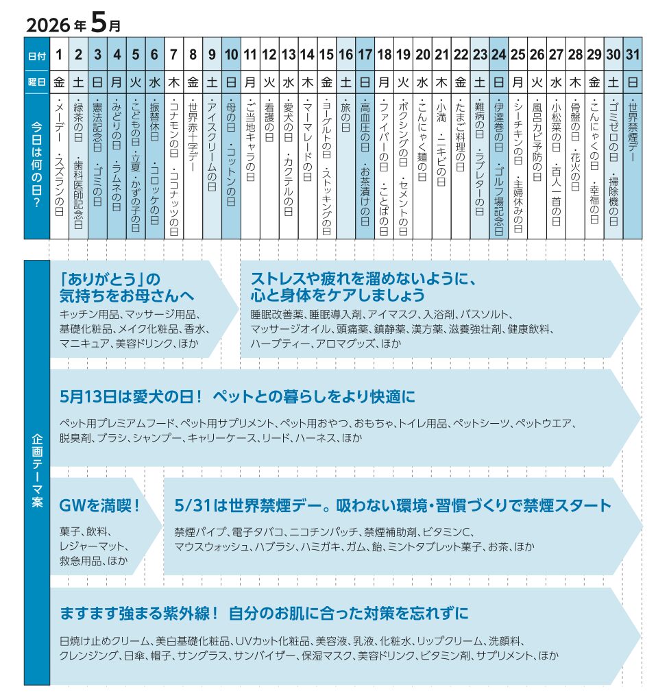 2026年4月・5月の販促企画書 トレーニングの日、よい歯の日、母の日、愛犬の日…。企画のネタ盛りだくさんの4月、5月 毎月のプロモーションのネタに便利に使える販促企画書。2026年4月、5月のアイディアです。 2026.02.20 投稿ナビゲーション 前の記事 バレンタイン、猫の日、新生活、春の衣替え…。企画のネタ盛りだくさんの2月、3月 次の記事 新生活、春の衣替え、トレーニングの日、よい歯の日…。企画のネタ盛りだくさんの3月、4月