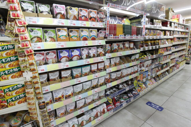 レトルトカレー売場はトライアルの「みなさまのお墨付き」とトライアルのPBが共存する売場に。